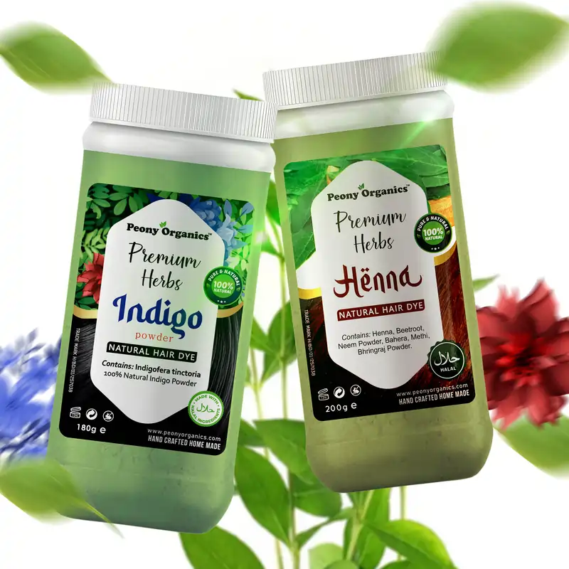 Elevate your hair care routine with Peony Organics Premium Herbs Indigo-Henna Combo, featuring two exquisite products designed to color your hair dark naturally.